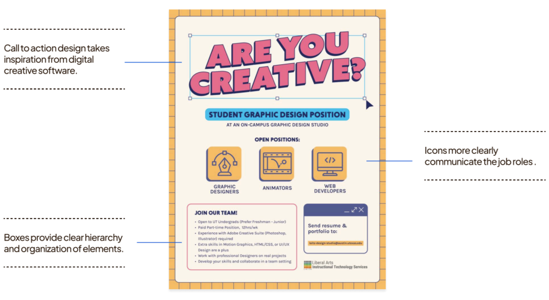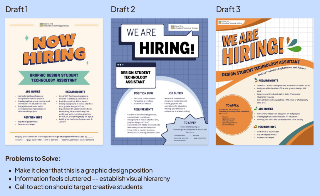 Designed a poster advertising the student graphic design position at the UT Austin LAITS department.