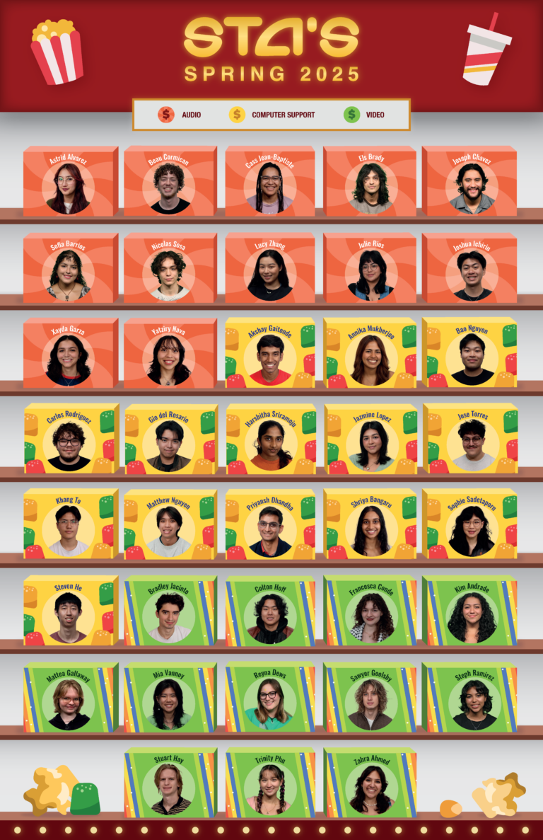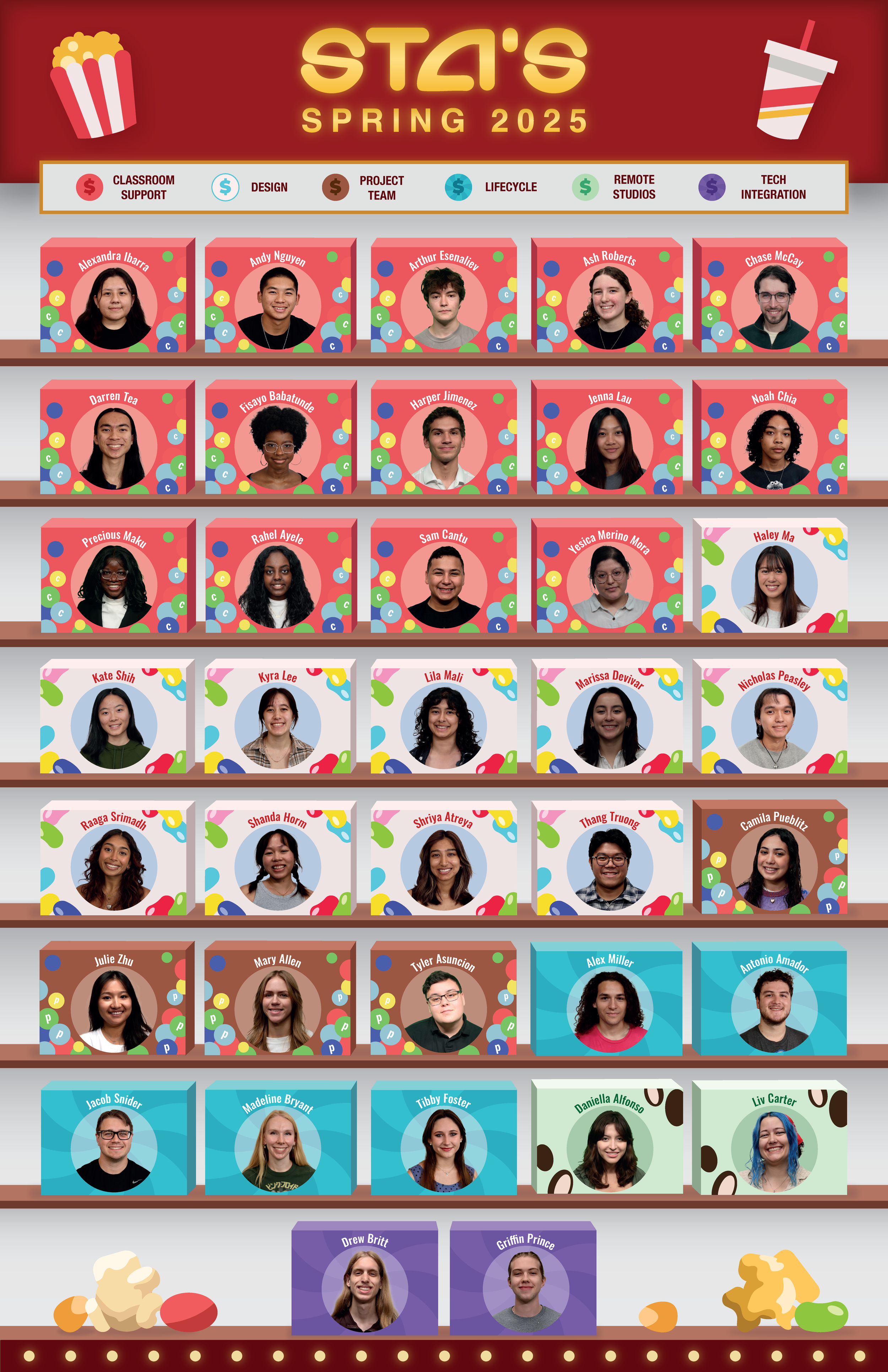 Created two posters featuring the names, headshots, and departments of all LAITS student employees. The Spring 2025 theme was movie theater concession stand with each department represented by a different candy.